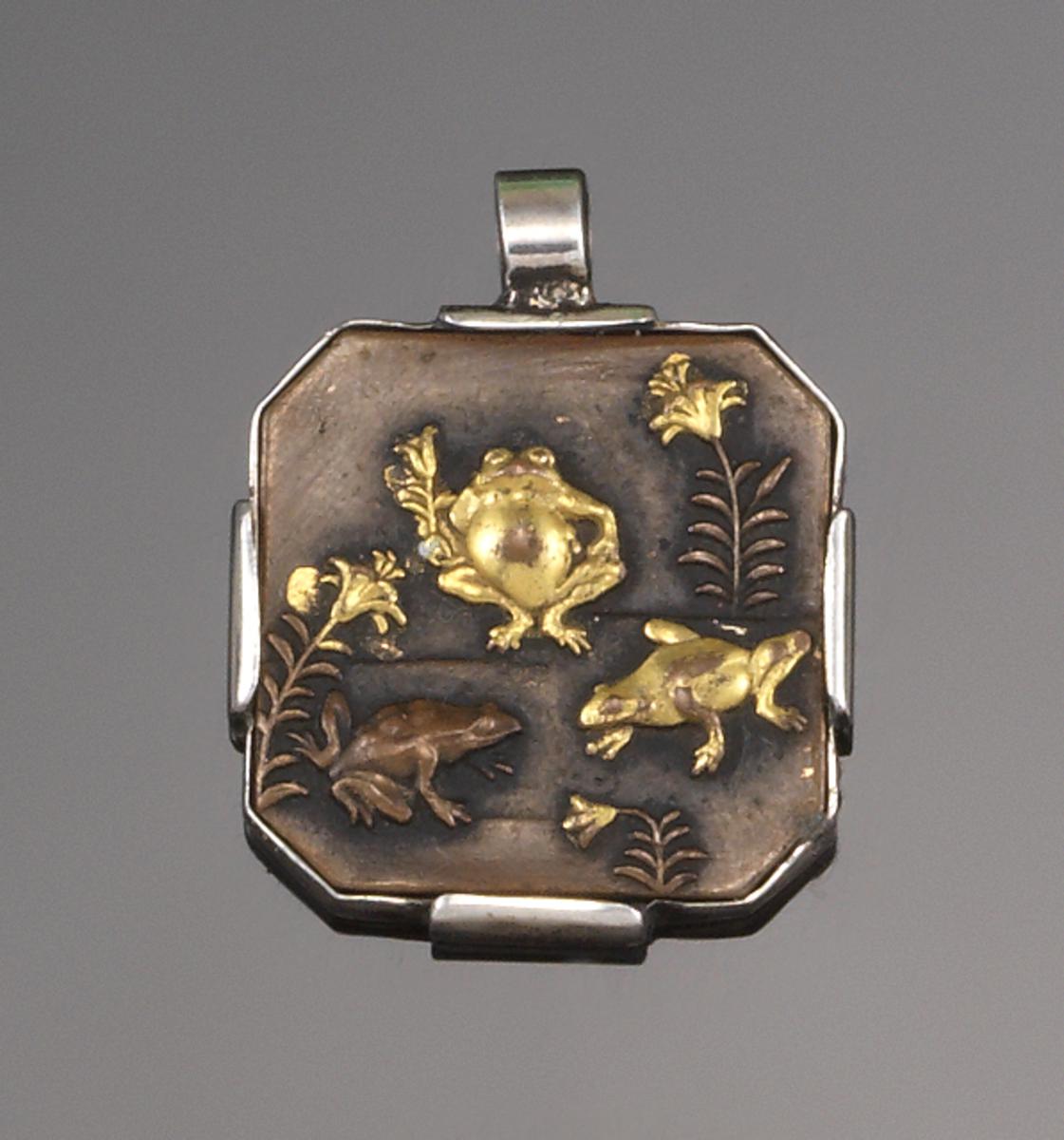A silver mounted shakudo pendant, of octagonal form and decorated with frogs and foliage. 2cm wide.