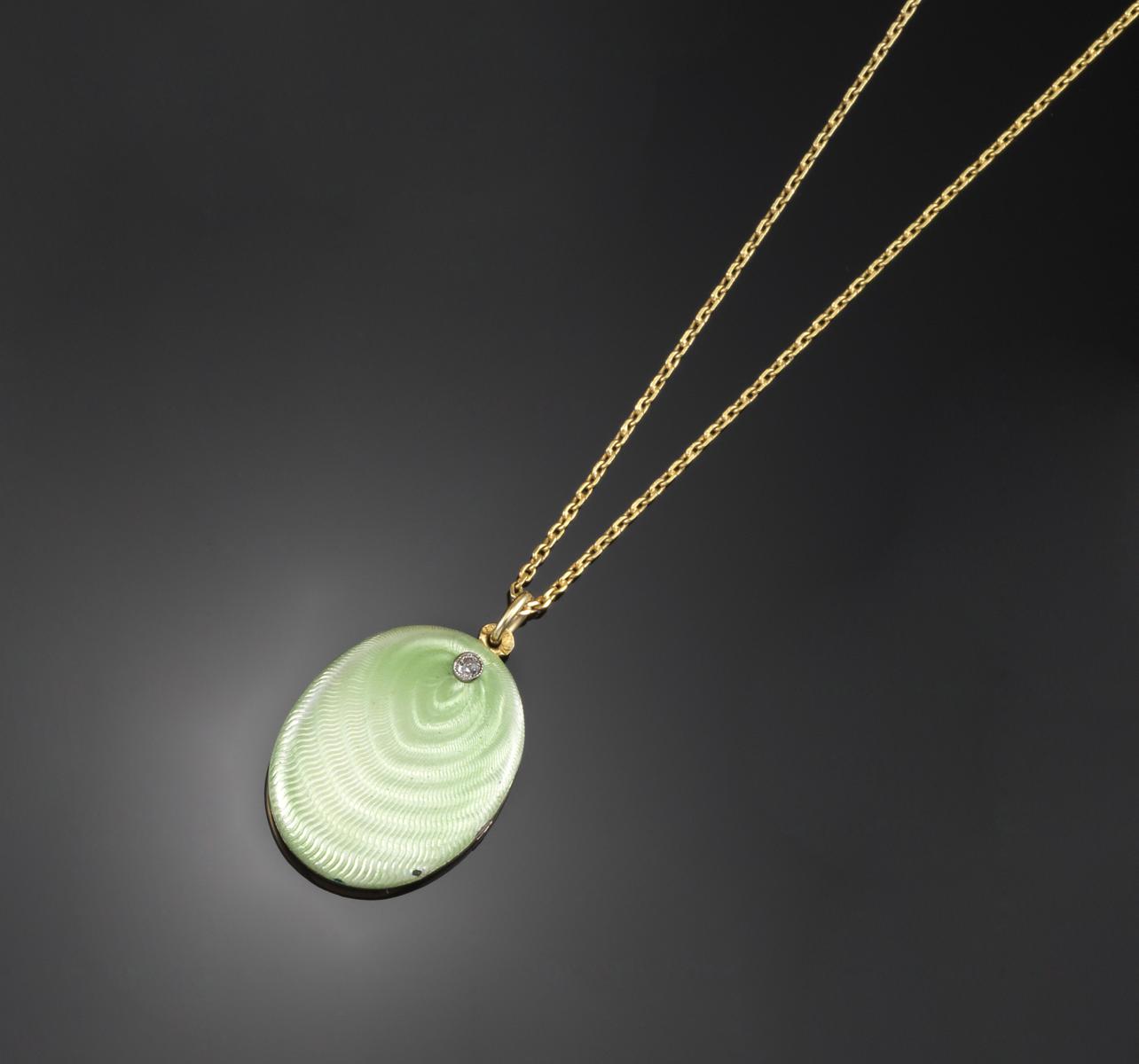 A Russian gold oval shaped locket pendant, the hinged cover decorated with light green guilloche enamel and set with a small diamond. The suspension loop marked with 56, kokoshnik and initials. 2.7cm wide. Suspended from a gold fine link neck chain with Russian marks to the clasp.