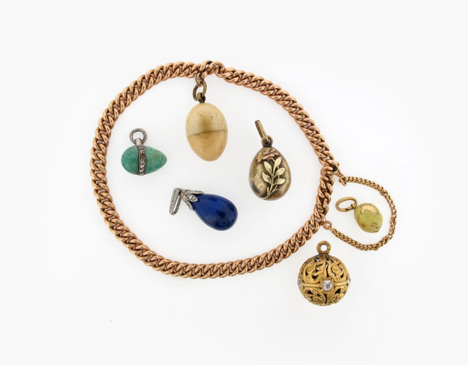 ‡. A Russian gold curb link bracelet, the clasp tongue with Russian marks, suspending an ivory egg form pendant which unscrews to the centre revealing a miniature carved chick. Together with a foliate pierced spherical pendant set with five diamonds, an egg shaped lapis lazuli pendant set with small diamonds, a green stone egg form pendant set with small diamonds. A gold egg pendant applied with a gold flower, and a small gold egg pendant with damaged enamel decoration.