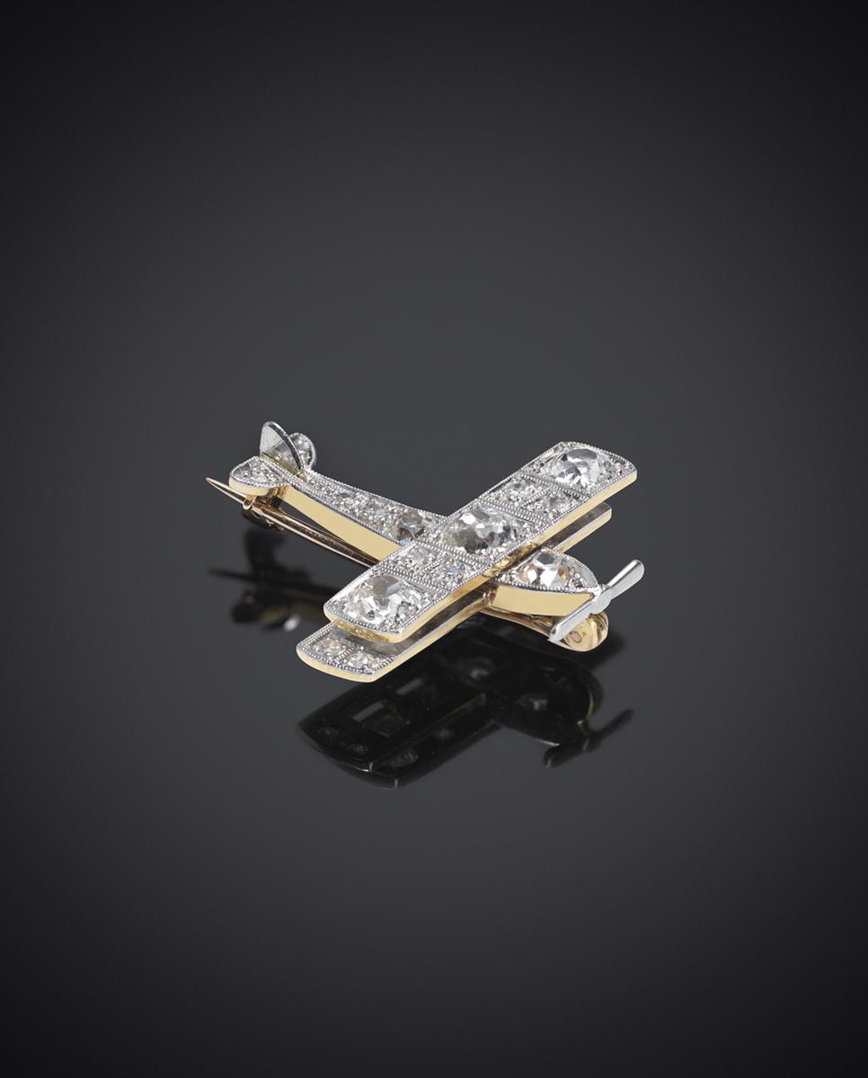 A diamond set brooch modelled as a biplane, C1930, milegrain set overall with graduated circular cut diamonds in silver and gold. 2.7cm long. Cased.