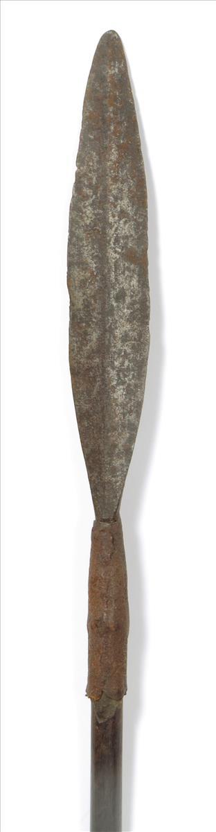 A native stabbing spear, with a raised grip, 110.3cm long.