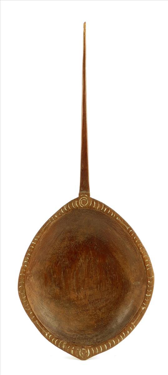 A Massim shallow bowl, with incised and limed decoration, with a long tapering handle, 52.5cm long.