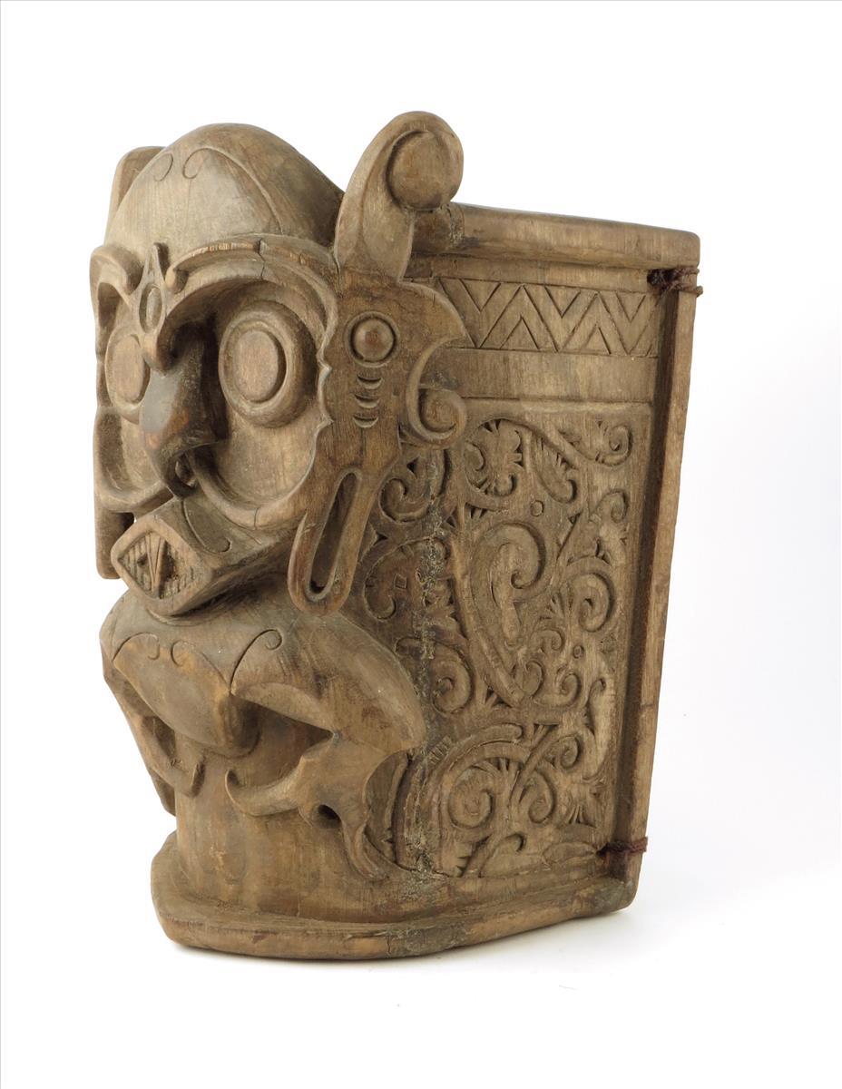 A Dayak baby carrier, Indonesia, carved a central ancestor figure and scroll decoration behind, with woven straps, 45.5cm high.