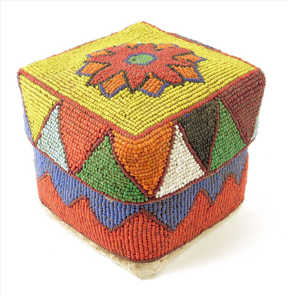 A Batak beadwork box and cover, with a woven grass and cloth ground, 14.5cm high.