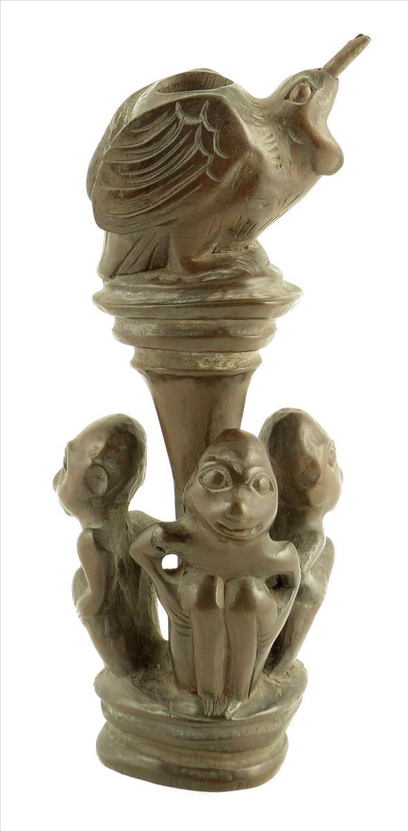 An Indonesian wax pourer for batik, carved wood with a metal spout, 21.9cm high.