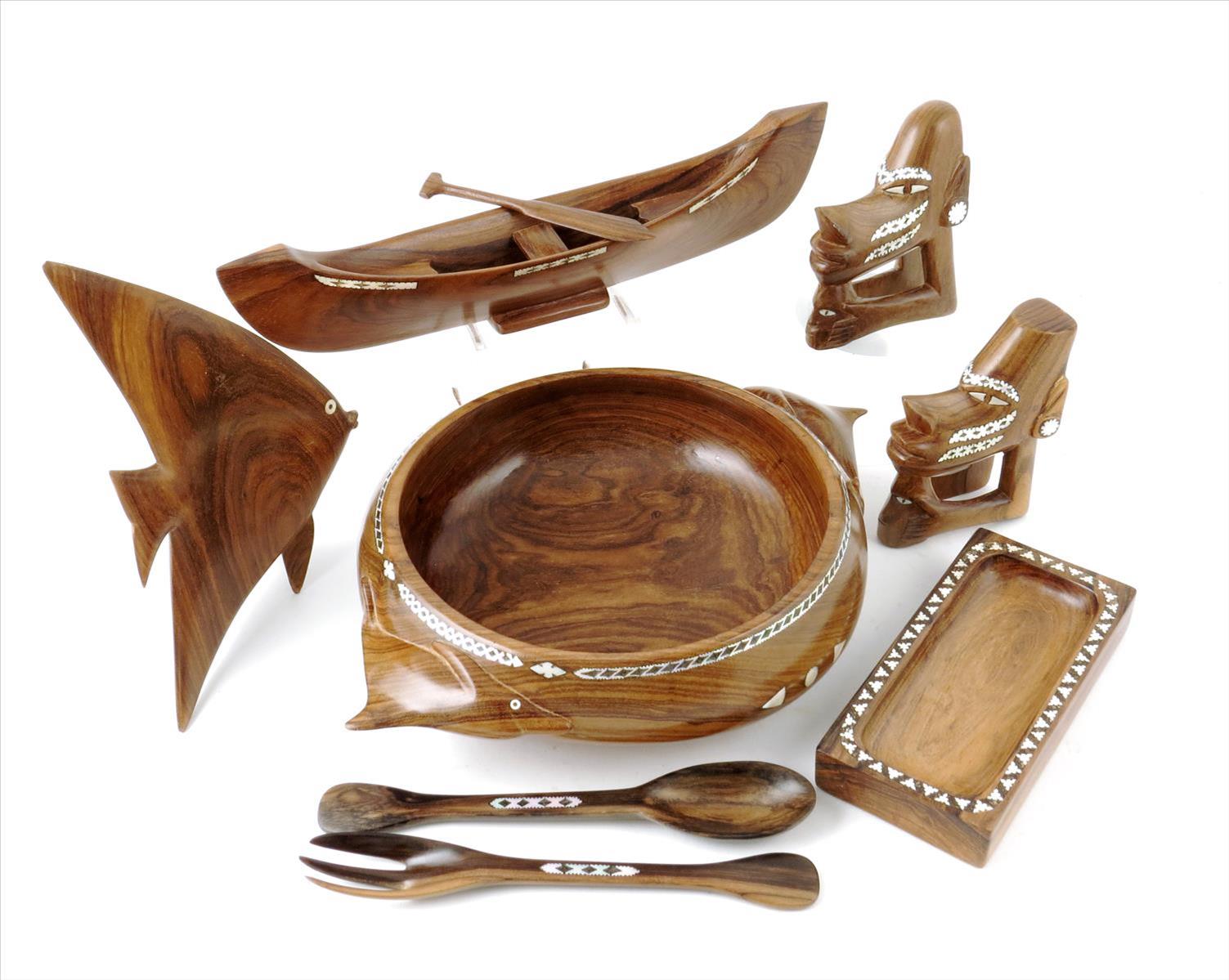 Solomon Islands; a modern bowl, with shell inlay, 28cm diameter, salad servers, canoe and paddle, fish ornament, dish, and two canoe prows. (9)