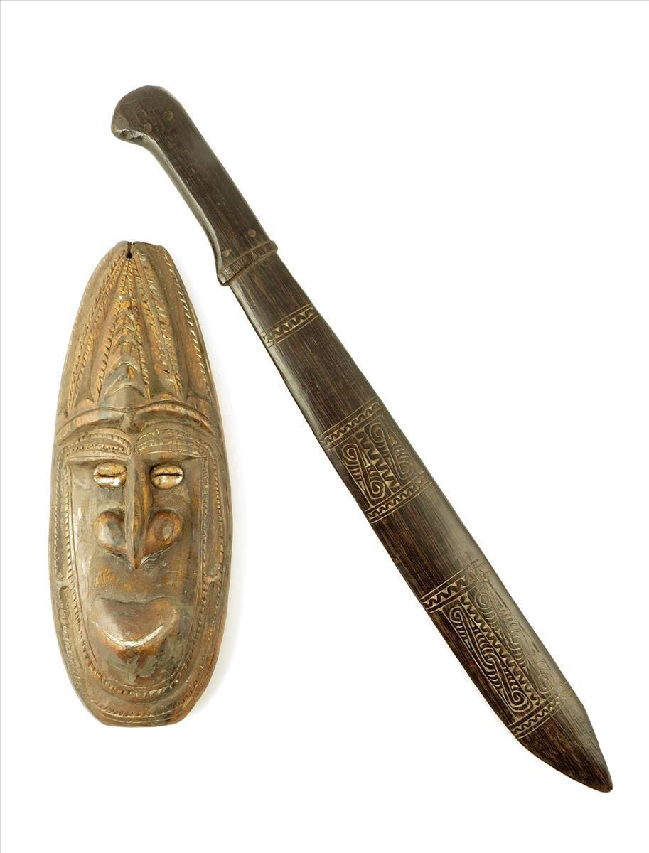 A Massim wood knife, with limed incised decoration, 67.7cm long and a Papua New Guinea mask, 38.1cm high. (2)