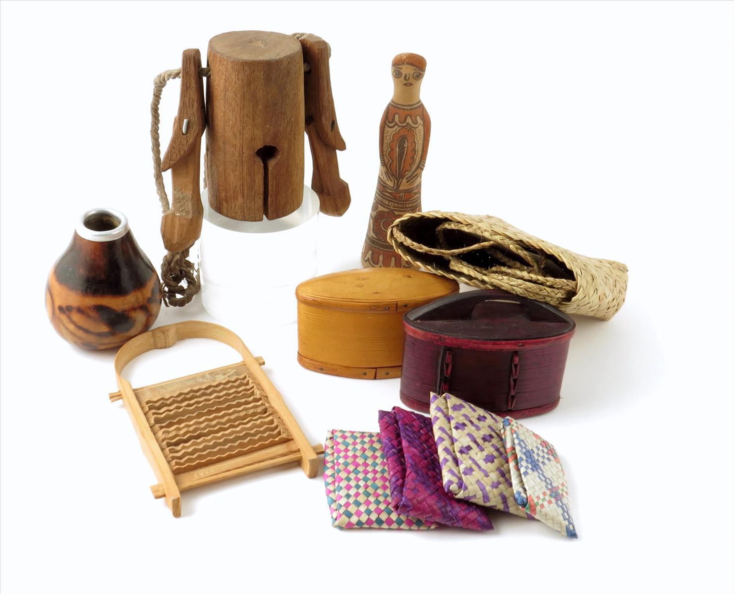 Two wood and bamboo eliptical containers, 12cm wide, a Maori flax purse with strap handle, four coloured purses, a bamboo grater, a gourd with metal rim, a pottery figure and a carved wood bell. (11)