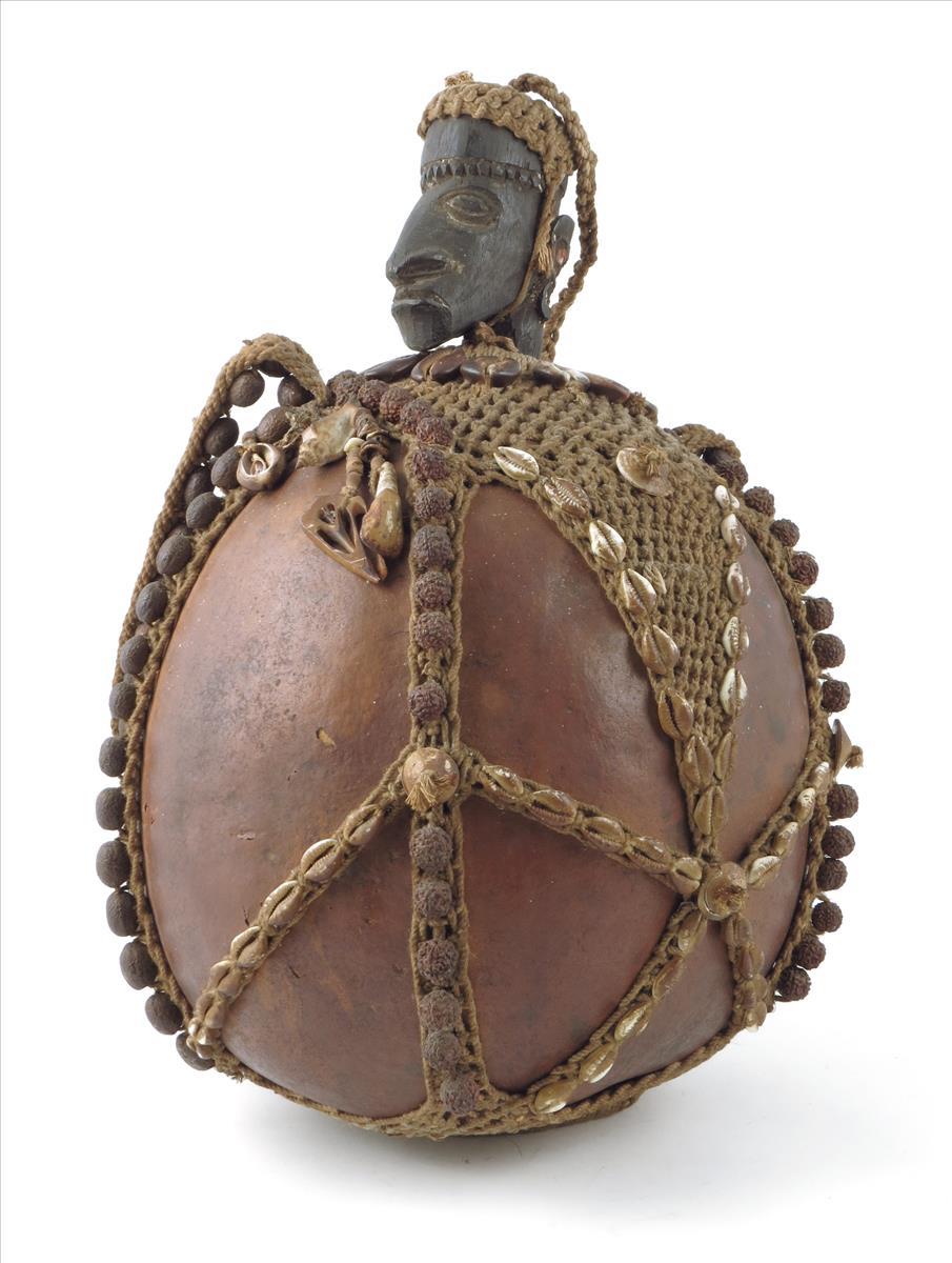 A Papua New Guinea water gourd, decorated plaited fibre, applied shells, beads and nuts, with a carved head stopper, with strap handle, 44cm high.