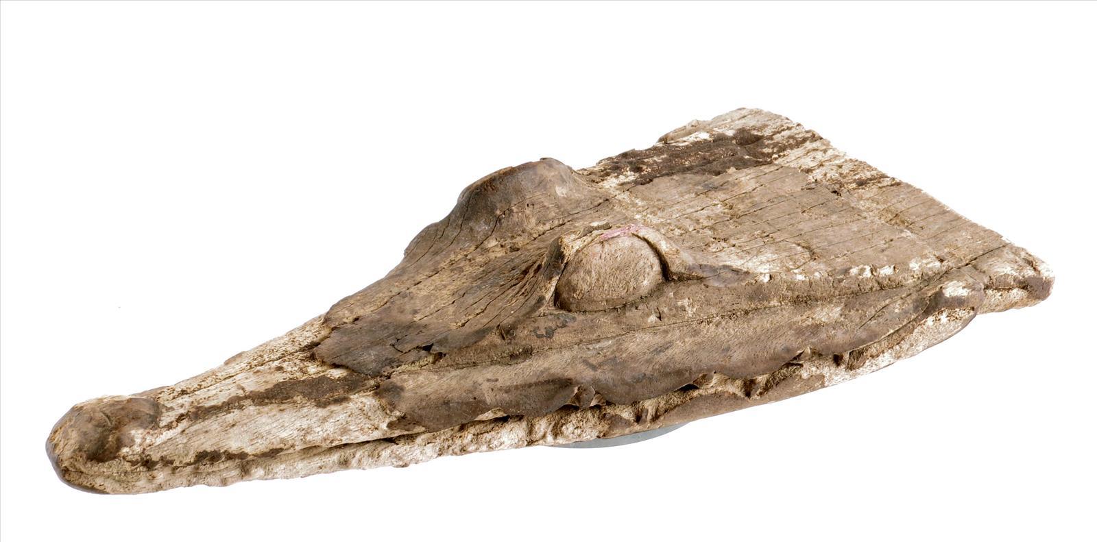 A carved wood crocodile head