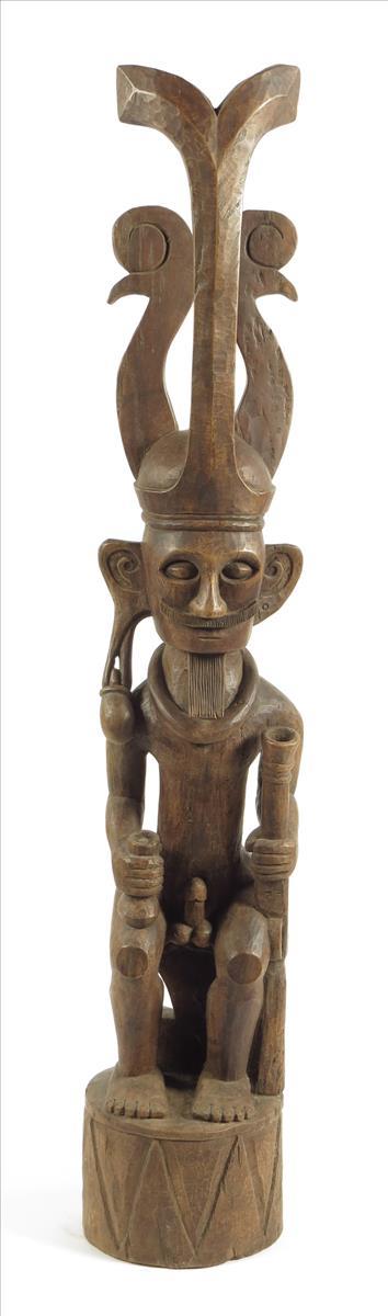 A Nias seated ancestor figure, Indonesia, with elongated headdress, earring in right ear, holding a blunderbuss and a flask, 146cm high.