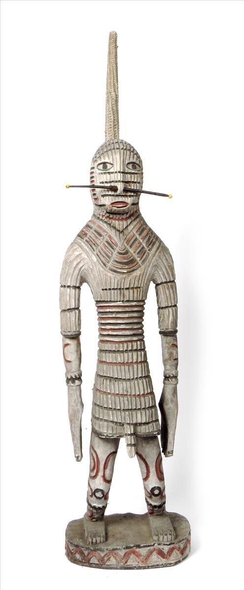 An Asmat male warrior, Papua New Guinea, with ribbed body and wearing a nose bar, with a covered spike to his back with feather, beads and seeds, 117cm high.
