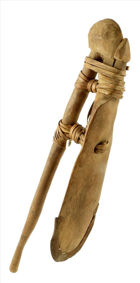 An Indonesian wooden adze, bound together with thick fibre, with a curved applied metal blade, 63.5cm long.