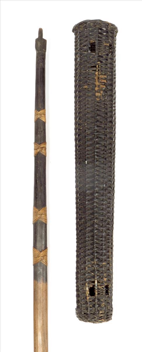 A Polynesian bamboo bow, part ebonised, 160.5cm long and a basket weave quiver, 56cm long. (2)