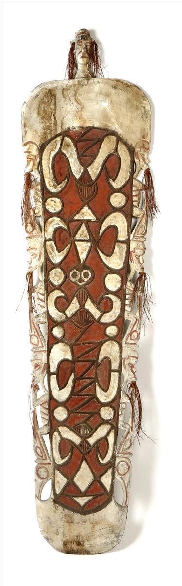 An Asmat shield, Papua New Guinea, with figures, scrolls and head surmount, tied fibre and a handle to the reverse, 190.5cm high.