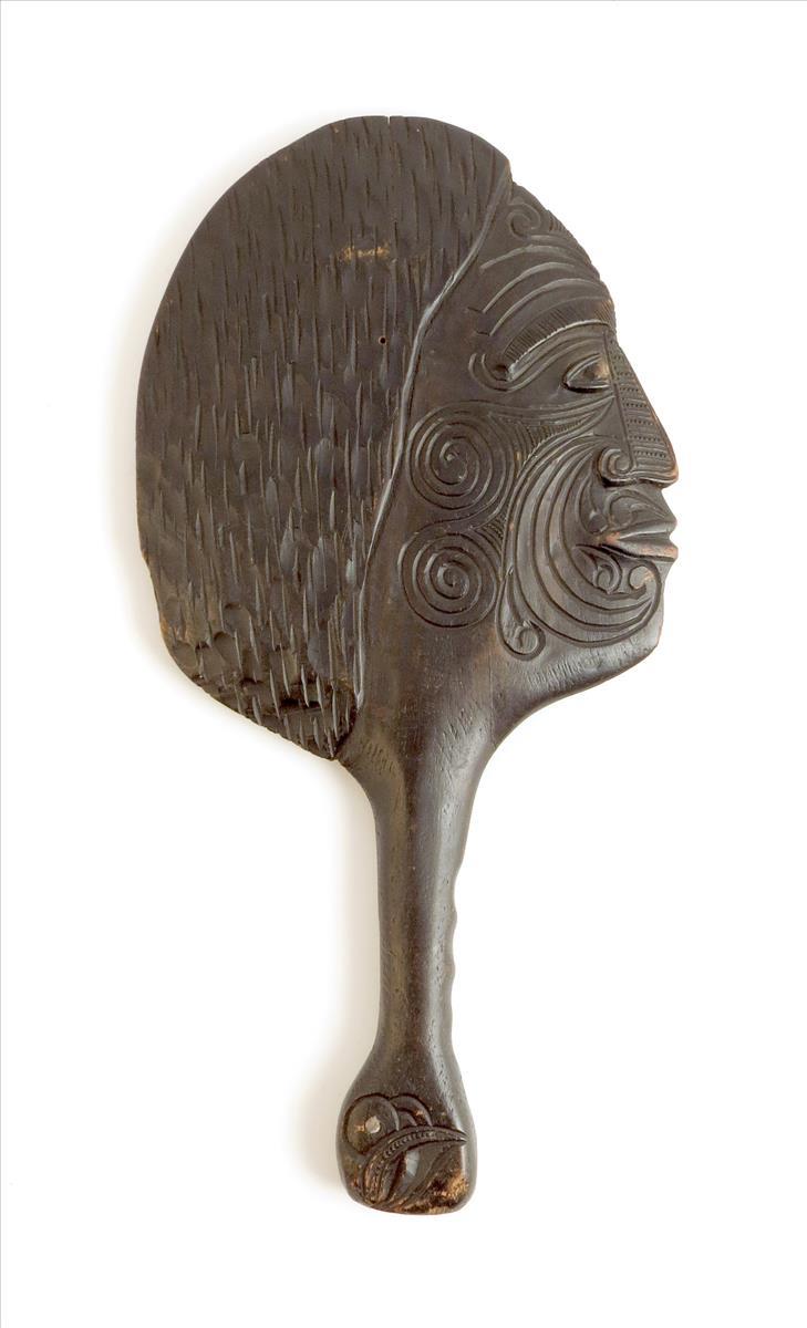 A Maori club, carved a head with scrolls to both sides, with abalone inlay, 42.7cm high.