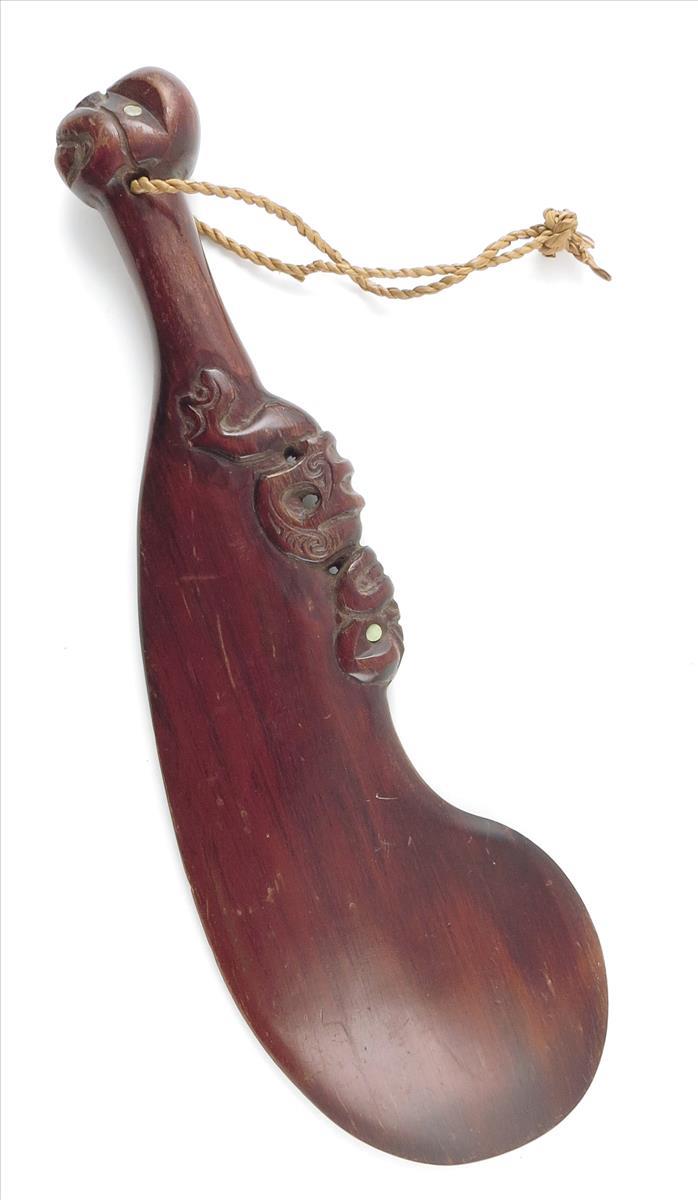 A Maori wahaika, carved tikis with abalone eyes, 40cm high.