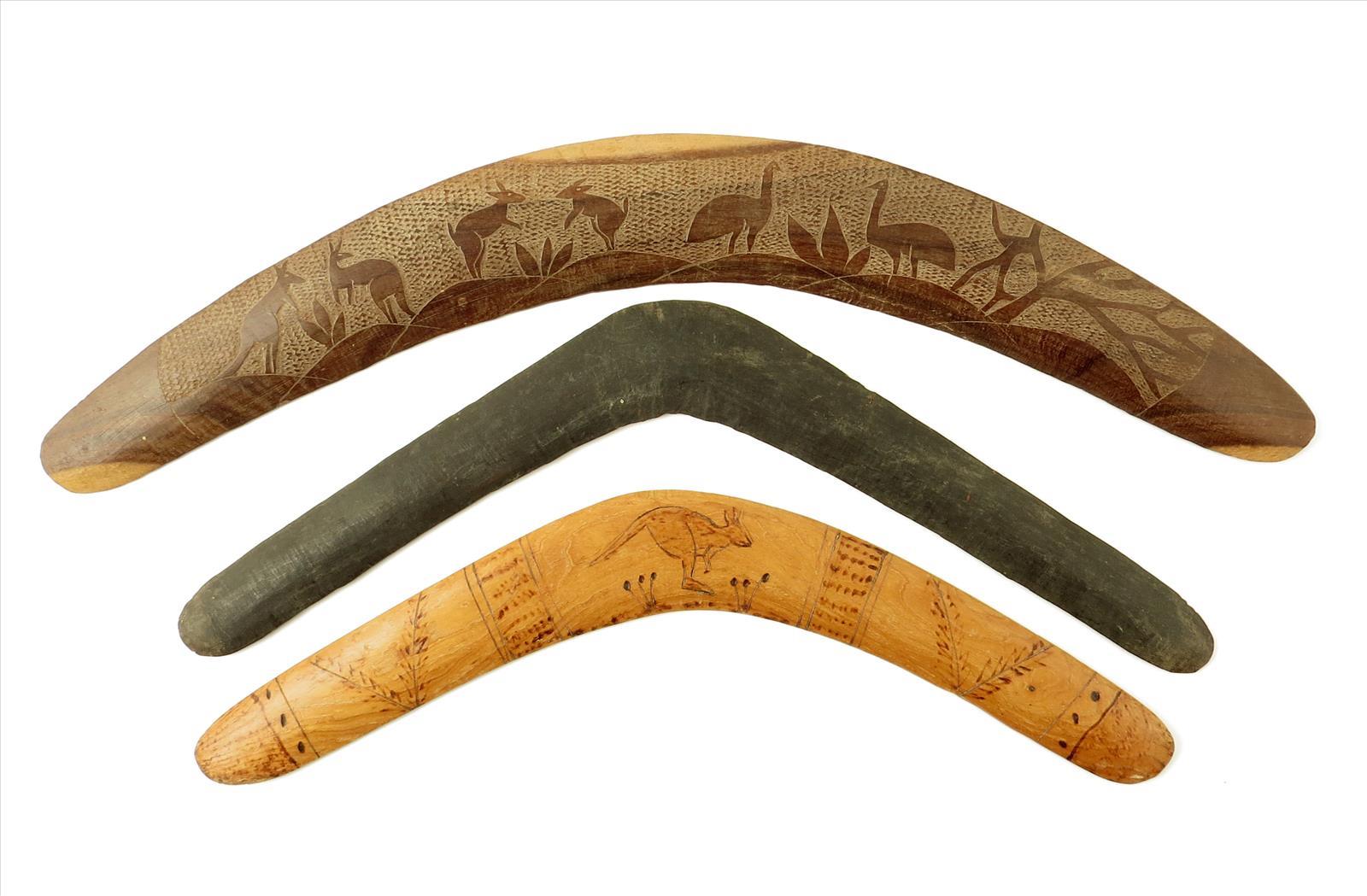Three Australian boomerangs; one decorated native animals