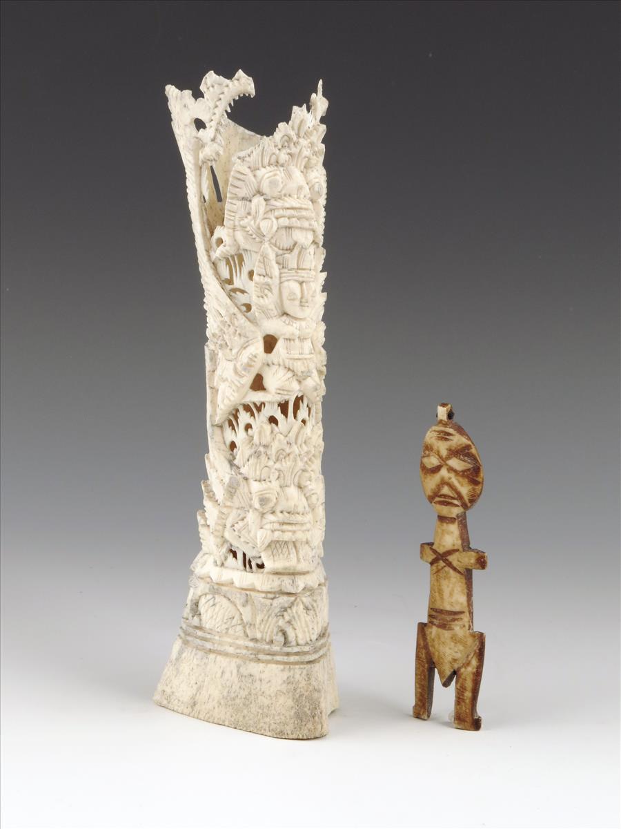 A carved bone amulet, 9.5cm high and an Indonesian carved bone shrine figure, 18cm high. (2)