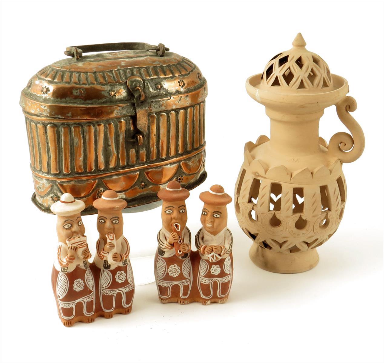 A Turkish copper water sprinkler, with a hinged cover and pierced base, 20.5cm wide, a pierced pottery lamp with cover, and two pairs of pottery figures. (4)