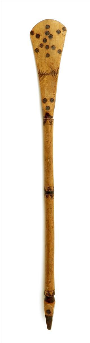 A South African wood paddle club, with incised and stamped ebonised decoration, 72cm long.