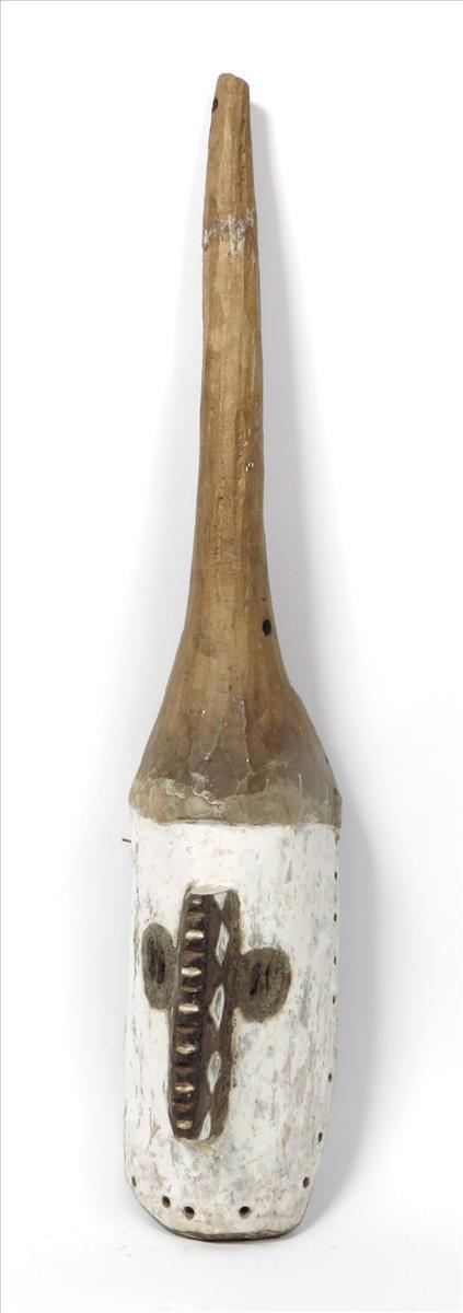 A Mossi mask, with conical surmount and ridged nose, with black, red and white pigment, 93cm (high).
