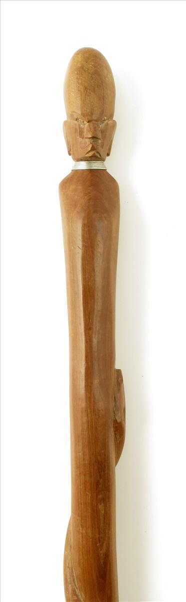 A Tanzanian carved wood staff, with a head finial and wire necklace on an entwined snake shaft, 94cm long.