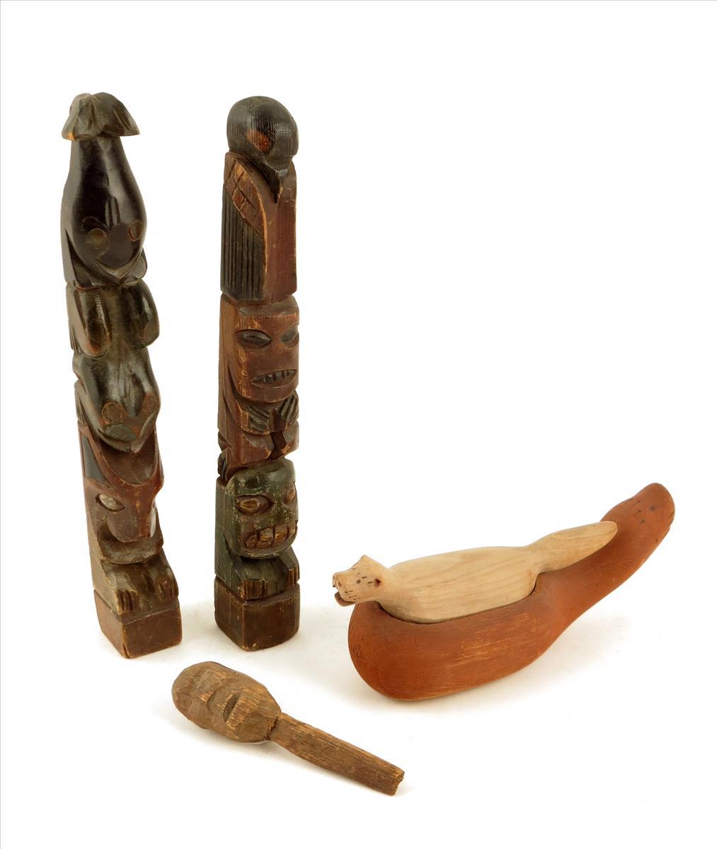 Two North American miniature totems, 20.2cm high, a carved driftwood box and cover, 16.5cm long, a carved head, 8.6cm high. (4)