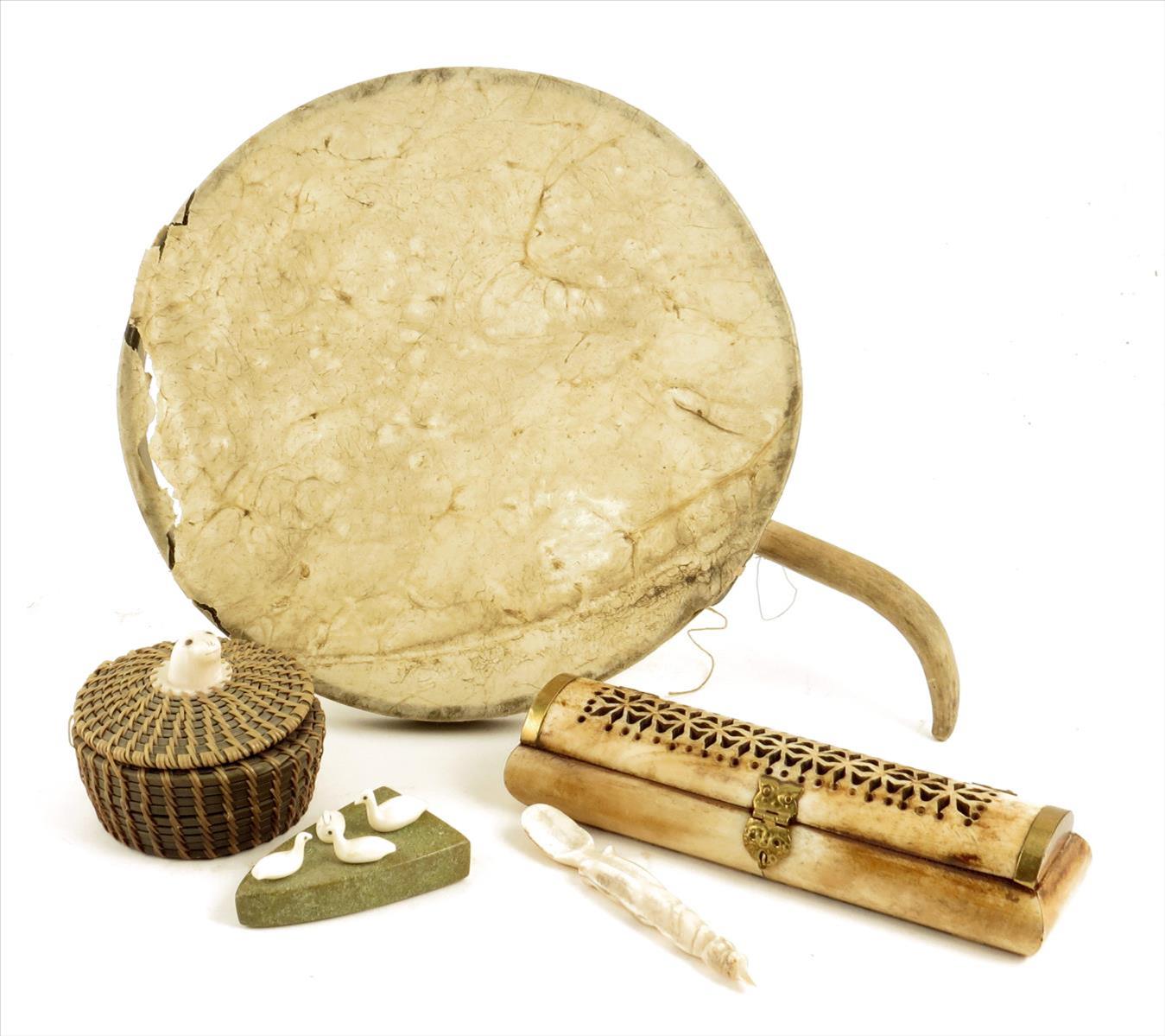 An Inuit baleen and bone circular box and cover, with a seal head terminal, 7cm high, an Inuit drum, bone, baleen and hide, 25.5cm diameter, an Inuit four bird bone and greenstone group, an Inuit bone spoon, a brass mounted bone box, 19.5cm long. (5)