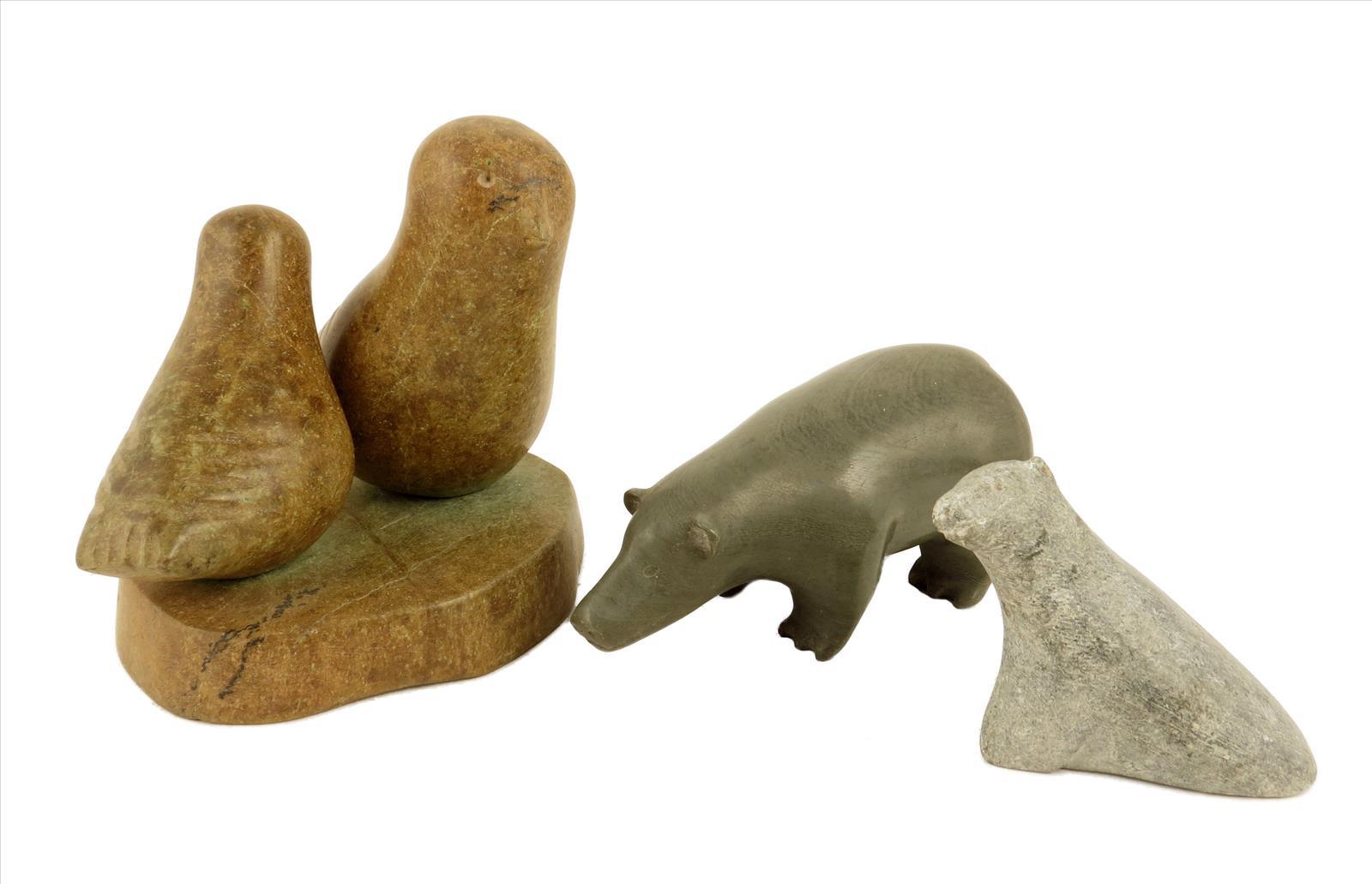 An Inuit greenstone polar bear, signed, 6cm high, a stone polar bear with Eskimo Art sticker and a double bird group. (3)