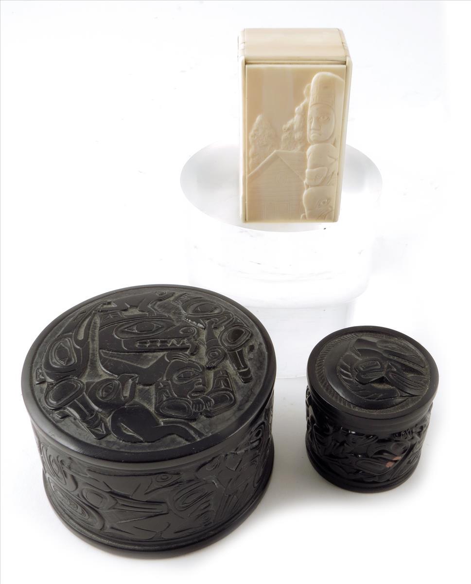 A Haida walrus box, the lid carved a totem and house, 7.5 x 4.5cm, and two modern boxes by Boma. (3)