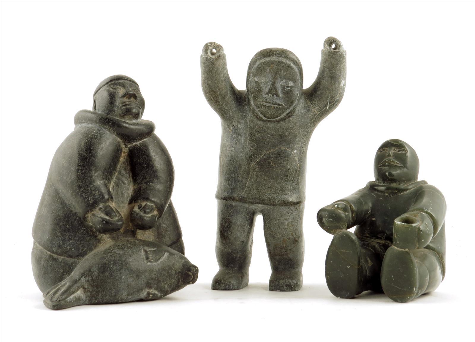 Three Inuit carved stone figures; two hunters, 14.5cm and 17.4cm high and seated, holding a cup, 10.5cm high, the smaller two signed. (3)