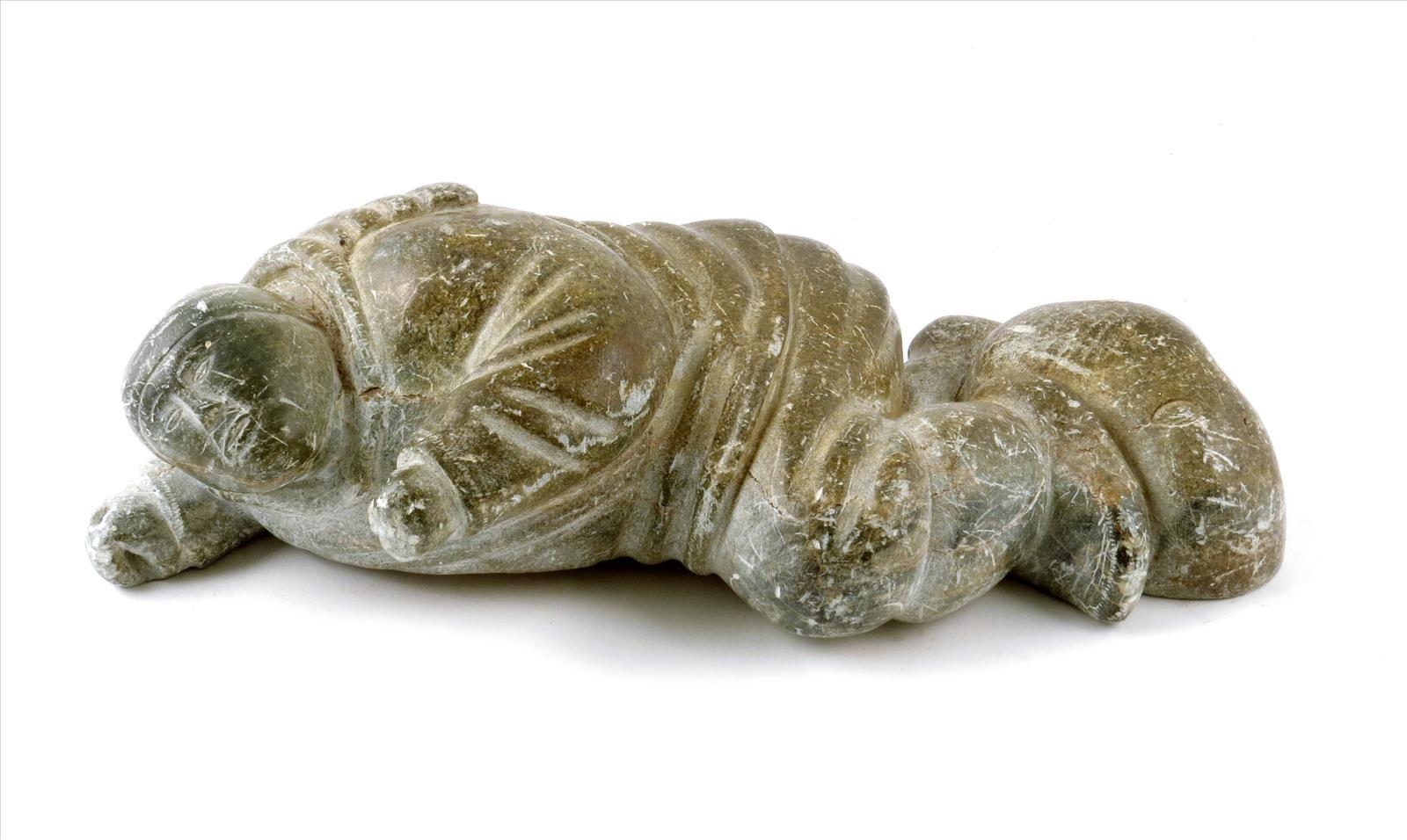 An Inuit soapstone recumbent fisherman