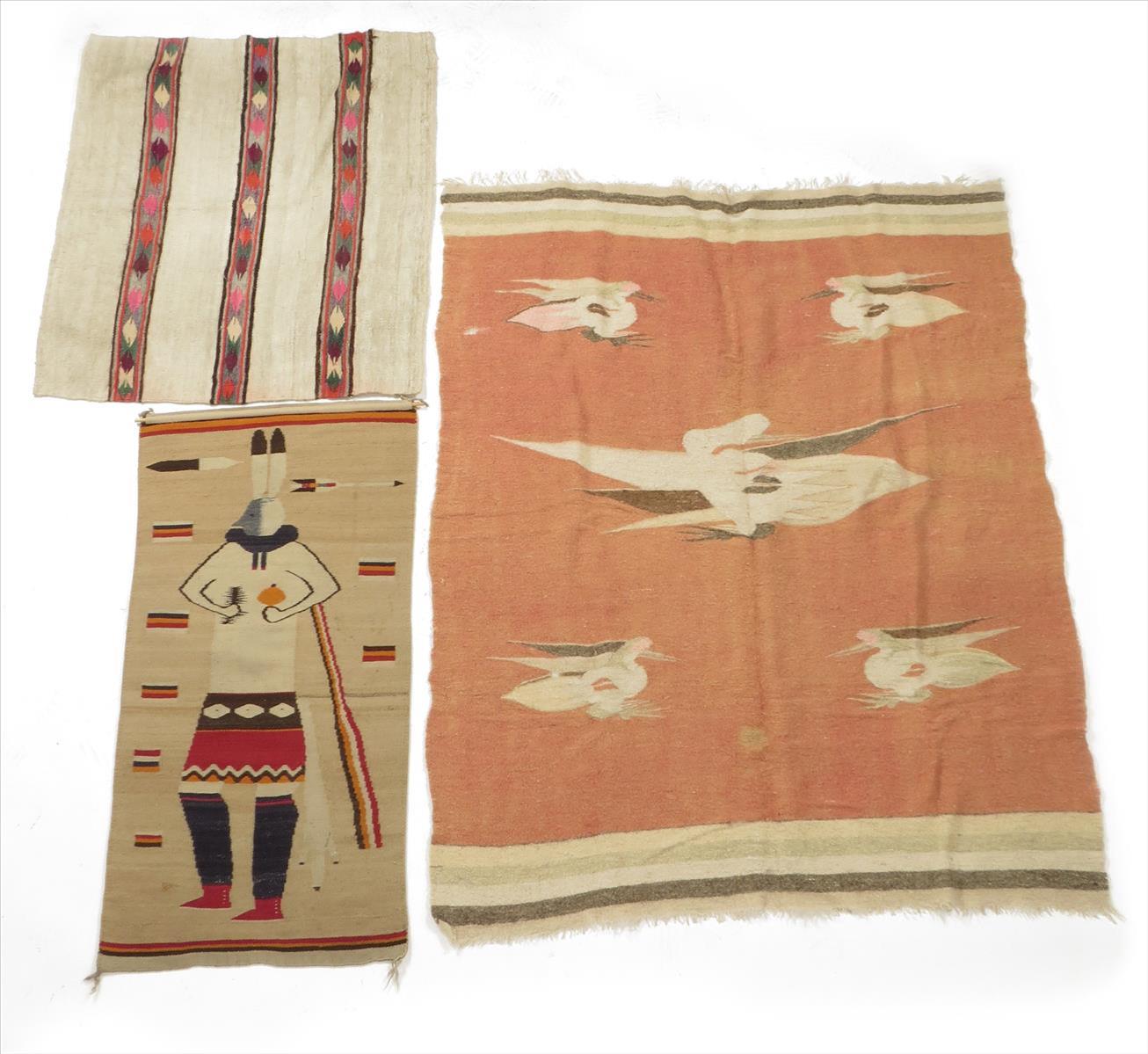 A North American rug, woven a figure with feather headdress, 114 x 58.5cm, a rug, woven five cranes, 168 x 134cm, a rug woven three bands, 88 x 101.5cm. (3)