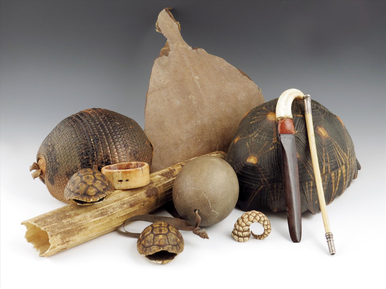 A collection of Natural History pieces; a tortoiseshell, 26cm long, two terrapin shells, 7cm long, an armadillo basket, an emu egg, a faceted tusk, a marine ivory ointment pot, 2.5cm high, a pangolin tail, a tusk handled letter opener, 23cm long, an Edwardian silver mounted bone pipe and a ray skin. (11)