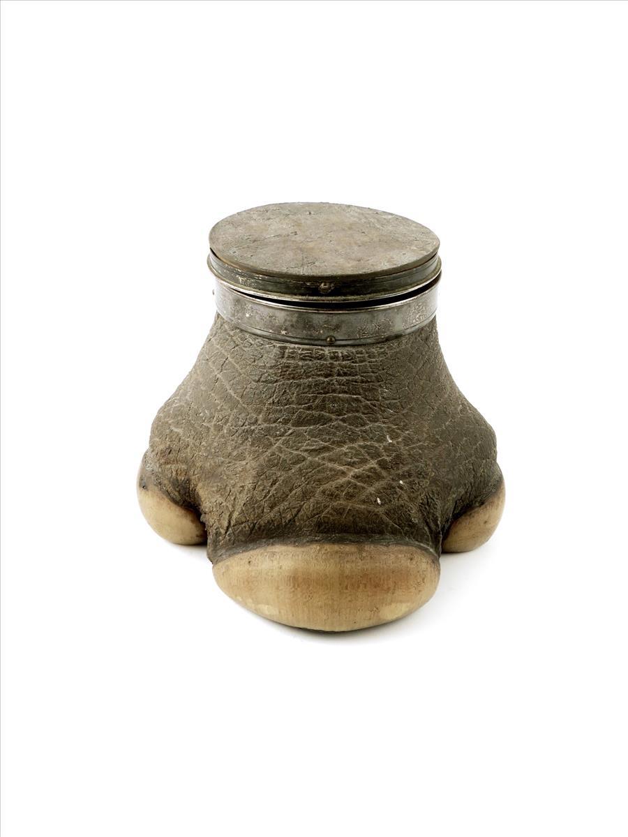 A silver mounted elephant foot casket
