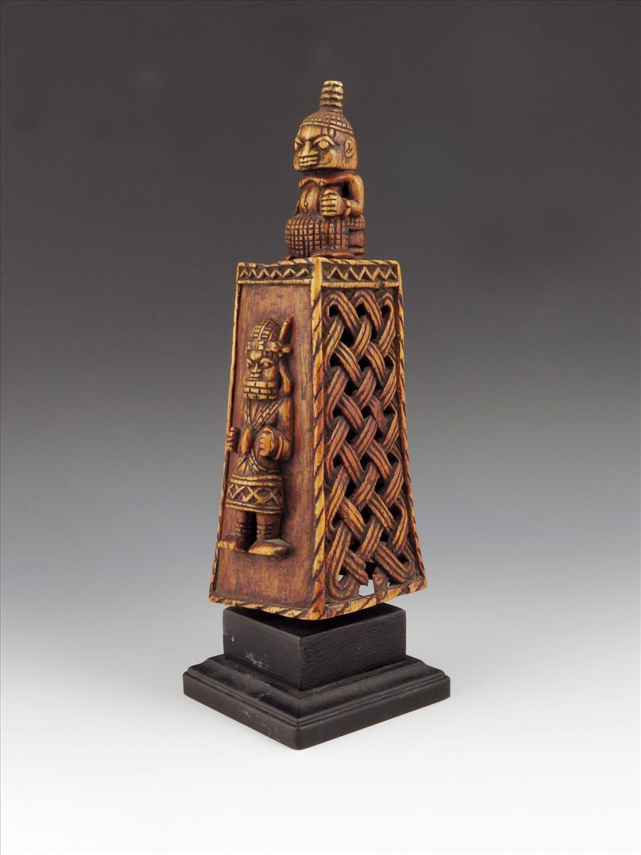 A Benin ivory bell, Nigeria, with a seated figure surmount on a square tapering body with pierced and carved interlaced sides, the front and back with relief carved standing figures, with a mask clapper, 25.5cm high on a later stand. (2)