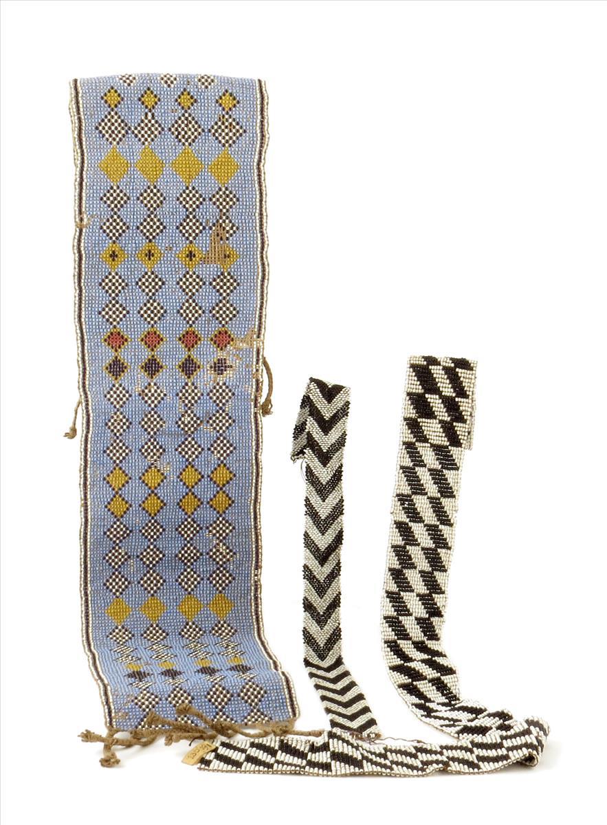 Three African beadwork bands, the largest 82cm long, the middle one with an inventory label '13091.' (3)
