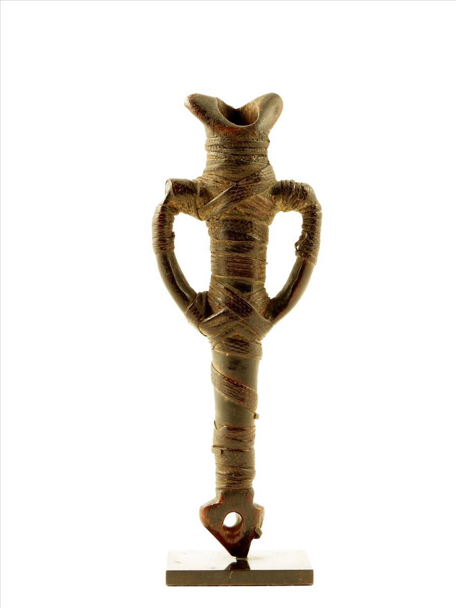 A Mossi whistle, Burkina Faso, wood and fibre bound, 16.5cm high, on a later stand. (2)