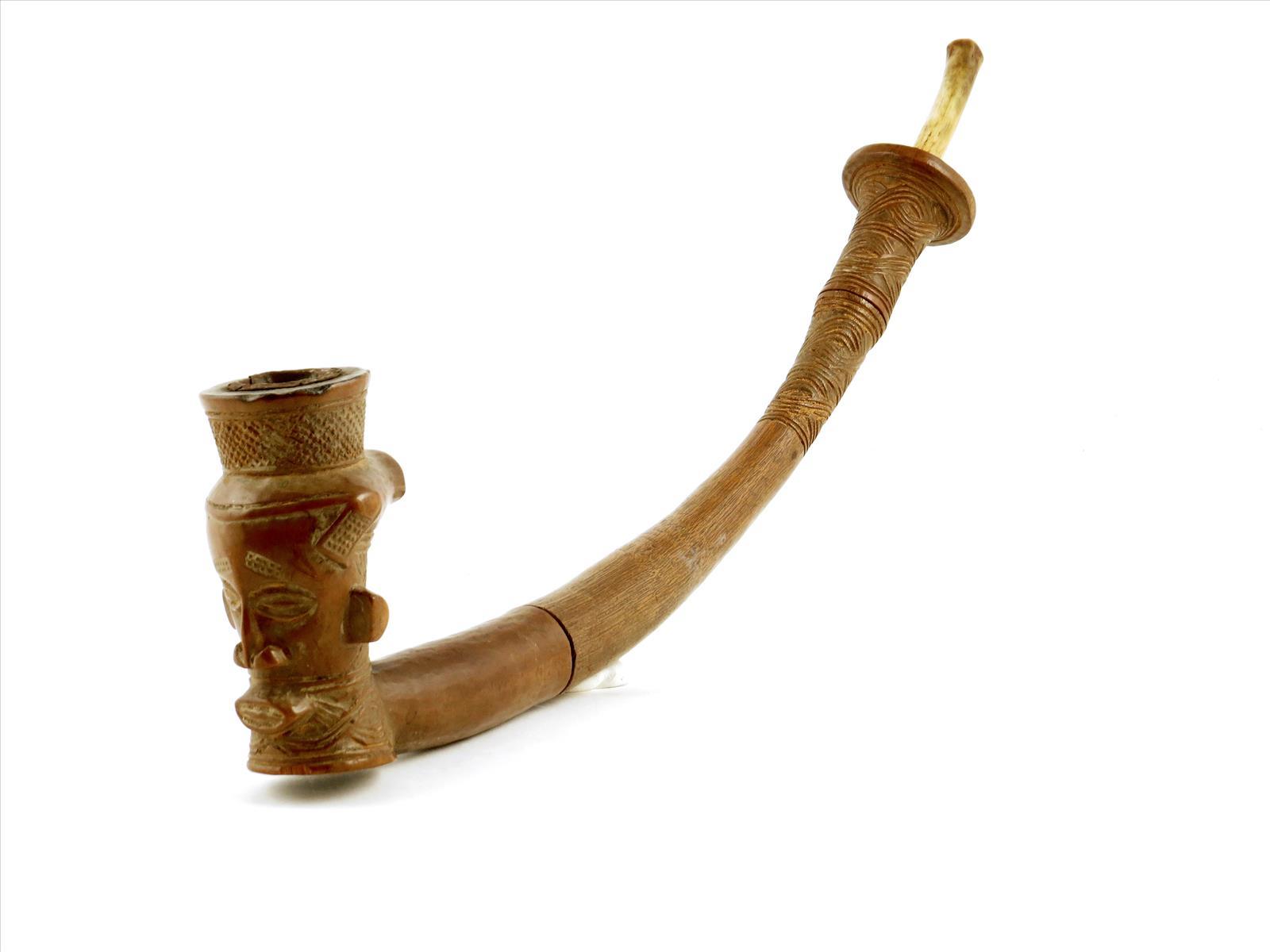 A Kuba wood pipe, D.R.Congo, with a carved bowl as a head with geometric decoration, with a detachable shaft with decorated end, with bone mouthpiece, 52cm long.