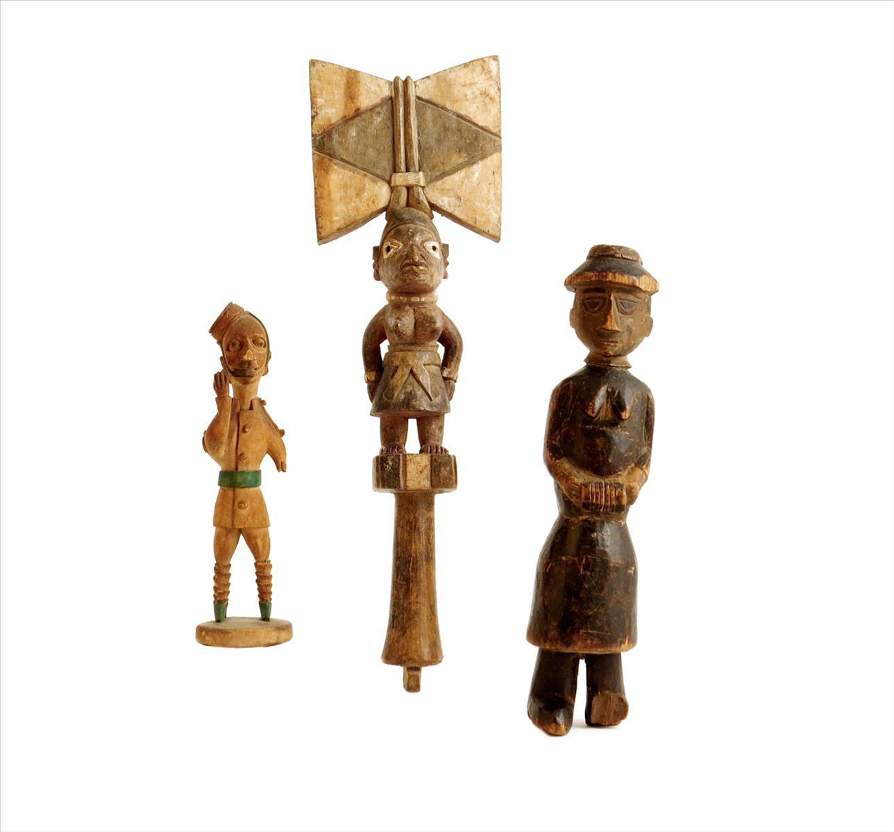A Nigerian carved colonial officer by Thomas Ona, 22.6cm high, a carved figure of a female missionary playing a squeeze box, 31.5cm high, a Yoruba staff for Shango, polychrome decorated, 43cm high. (3)