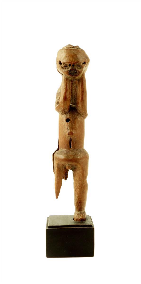 A Hungaan wood figure, D.R.Congo, standing with arms under chin with a ridged swept back coiffure, the back inscribed R S, H RS, 20.5cm high, on a later stand.