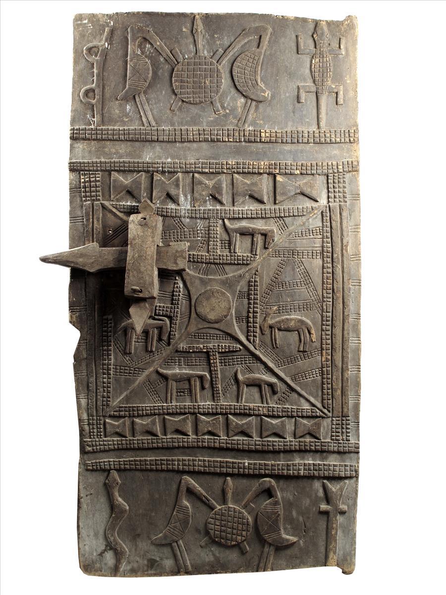 A Senufo carved wood door, decorated birds, reptiles, dogs, antelopes, a staff and geometric patterns, with lock, 55 x 28½in (139.6 x 72.4cm).