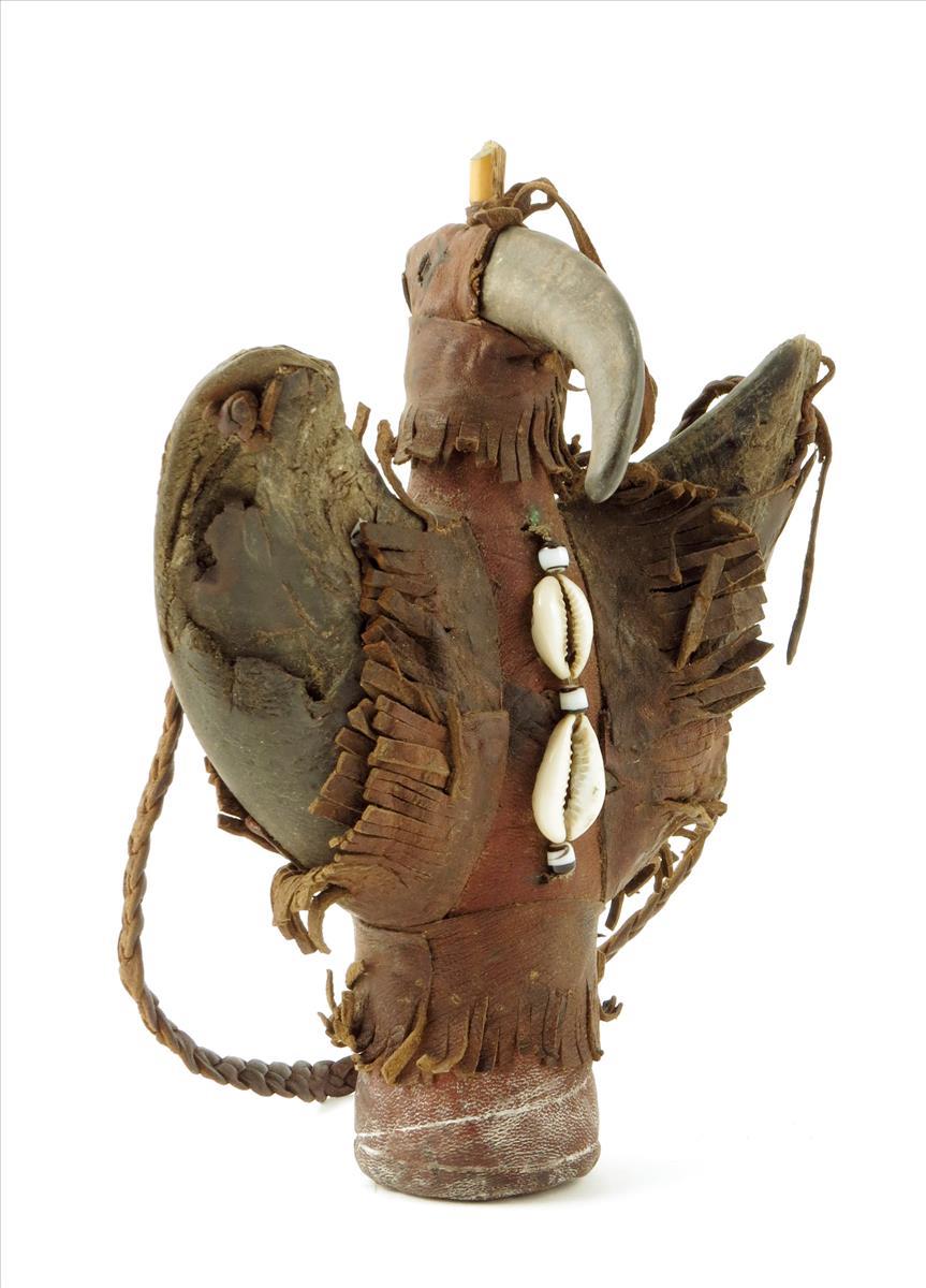 A leather thunderbird container, with horn, beads and shells, with a notched and pointed wood stopper, with handle, 22.5cm high.