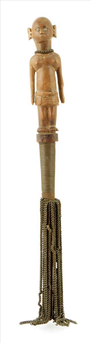 A Tanzanian wood staff, carved a standing female figure with metal eyes, on a shaft with wire and chains, 37.5cm high.