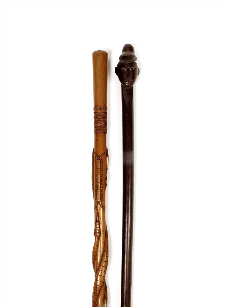 Two Tanzanian staffs; one carved snakes
