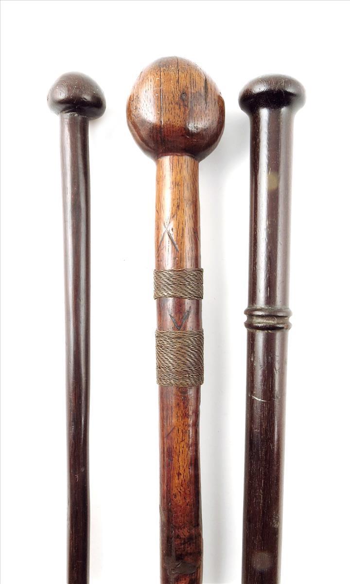 A South African wood staff, with incised decoration and bands of wire, 19th century, 86cm long, a staff with knop finial, 87cm long and a cane with twin ring shoulder and flattened knop finial, 75.5cm long. (3)