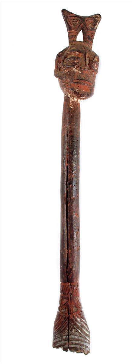 A Yoruba staff, carved a mask with shaped cresting to a flattened carved terminal, traces of red and white pigment, 17in (43cm) long.