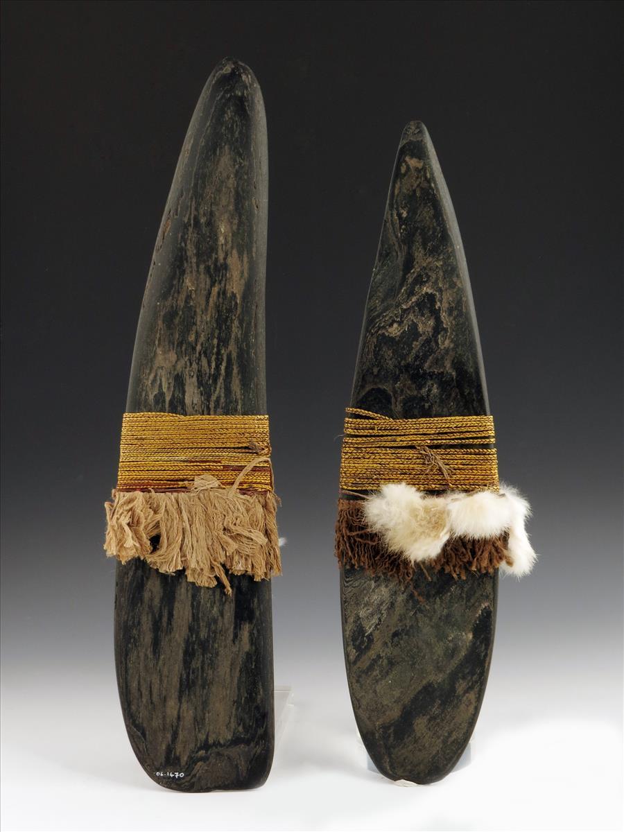 Two Dani currency stone, Papua New Guinea, with plaited fibre and fur, 52.6cm and 60.4cm high. (2)