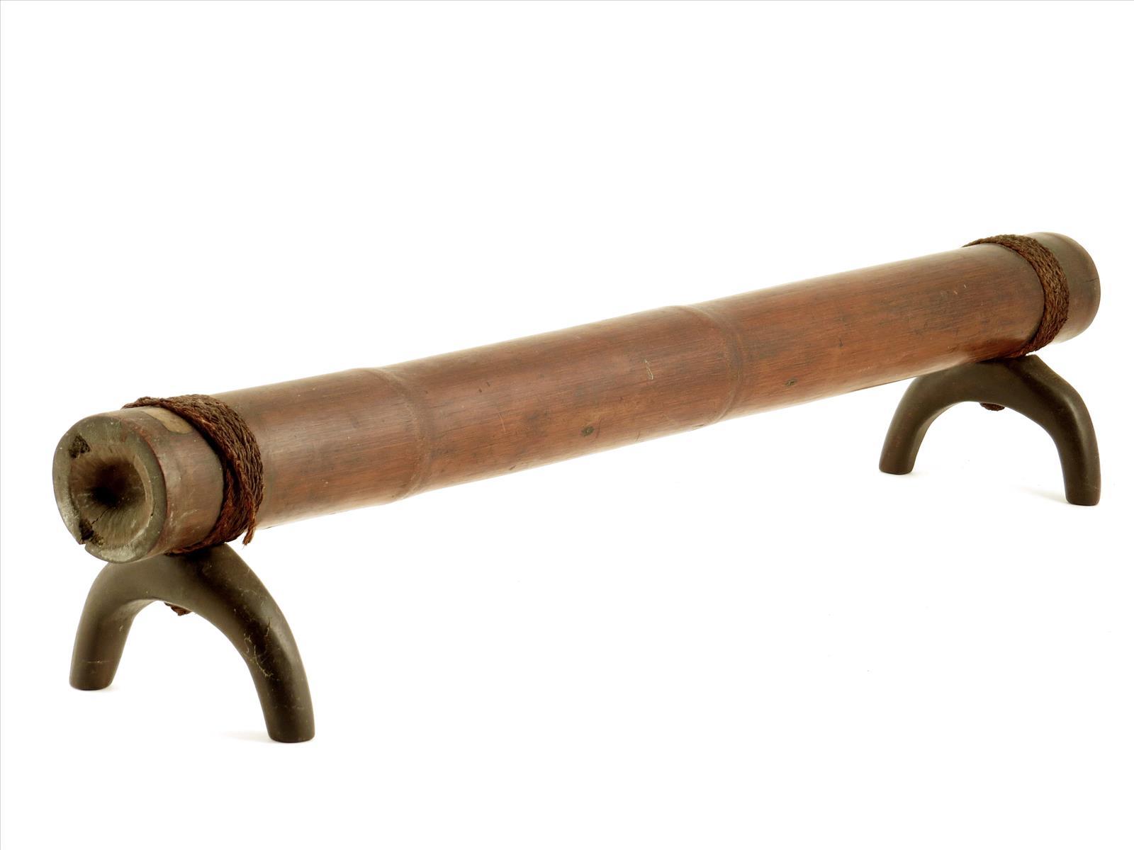 A Fiji headrest, with wood scroll legs with sennit binding, old label numbered '281', 84.2cm long.